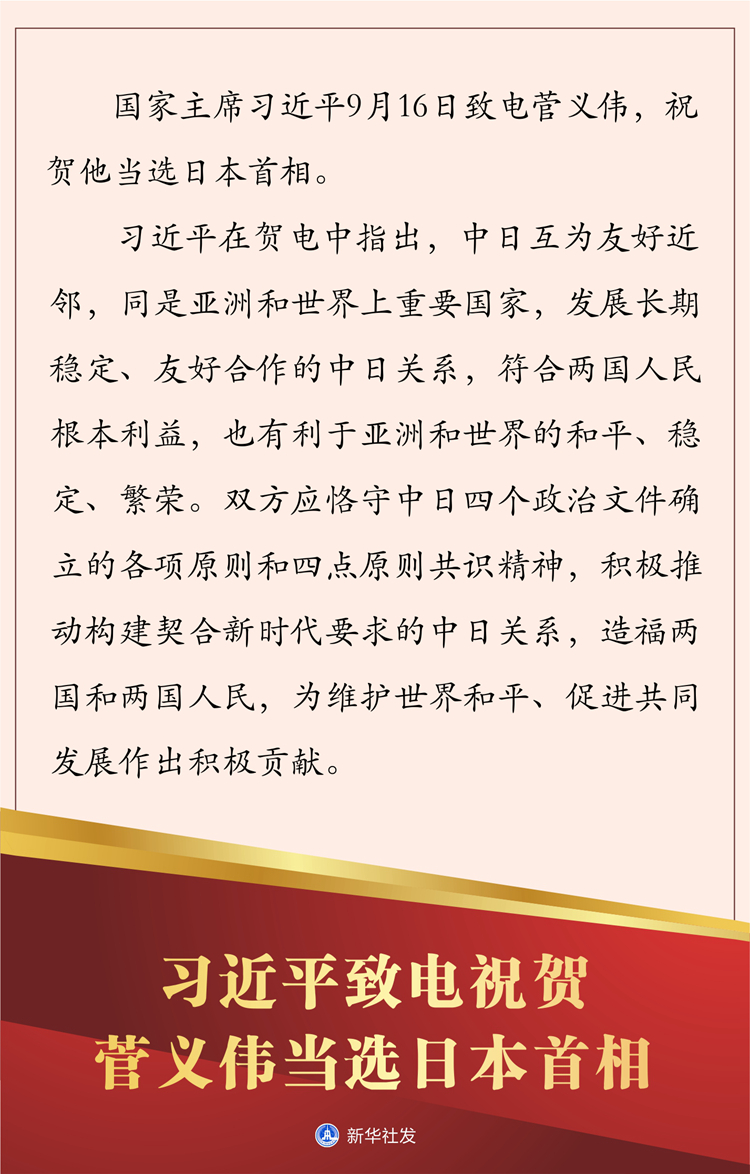 新華社北京9月16日電 國家主席習近平今天致電菅義偉,祝賀他當選日本首相。