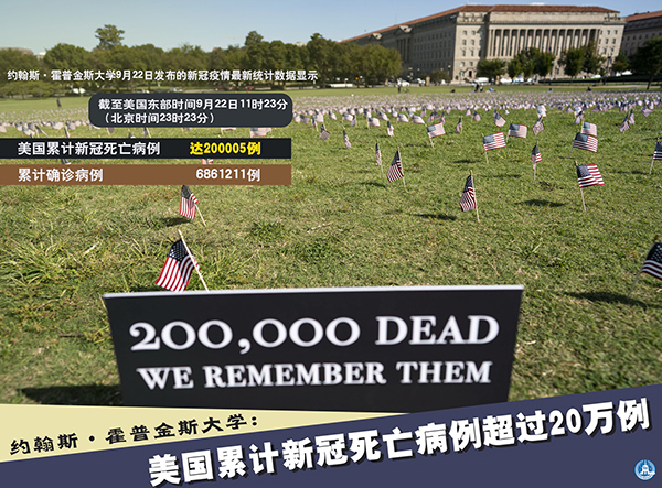 海報:約翰斯·霍普金斯大學:美國累計新冠死亡病例超過20萬例 新華社記者 劉茜 編制