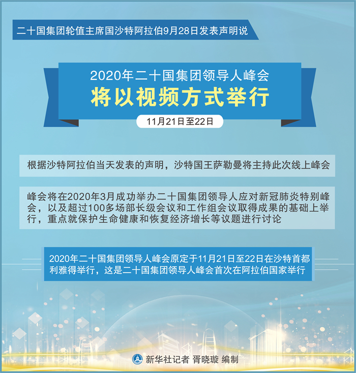 根據(jù)沙特阿拉伯當(dāng)天發(fā)表的聲明,沙特國王薩勒曼將主持此次線上峰會。峰會將在今年3月成功舉辦二十國集團(tuán)領(lǐng)導(dǎo)人應(yīng)對新冠肺炎特別峰會,以及超過100多場部長級會議和工作組會議取得成果的基礎(chǔ)上舉行,重點(diǎn)就保護(hù)生命健康和恢復(fù)經(jīng)濟(jì)增長等議題進(jìn)行討論。