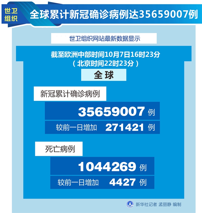 新華社日內瓦10月7日電(記者劉曲)世界衛生組織7日公布的最新數據顯示,全球累計新冠確診病例達35659007例。