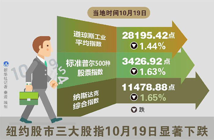 新華社快訊:紐約股市三大股指19日下跌,其中,道指跌1.44%,標(biāo)普指數(shù)跌1.63%,納斯達(dá)克指數(shù)跌1.65%。