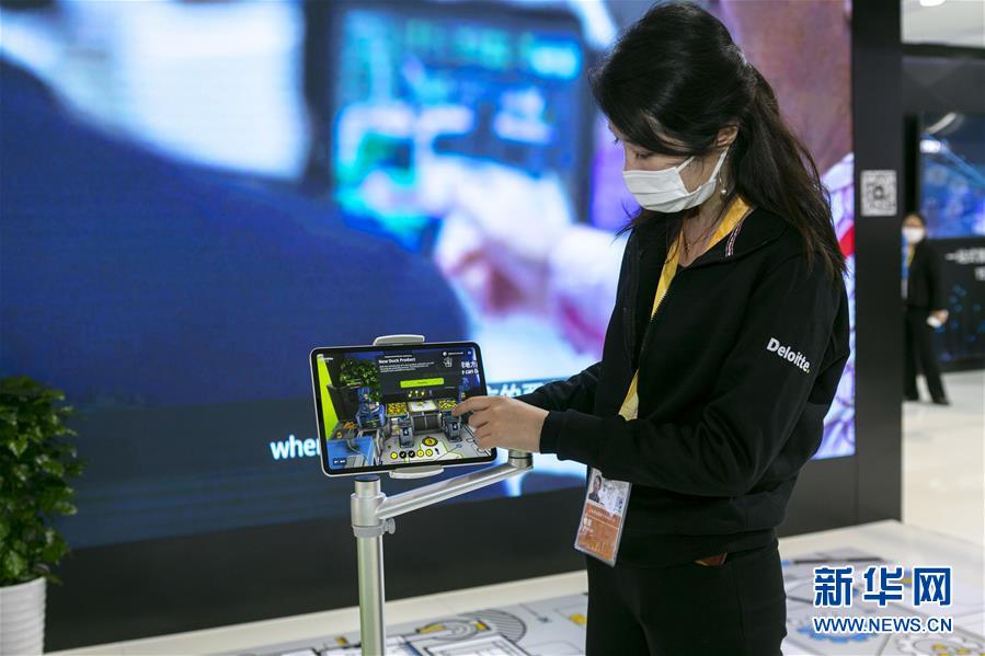 11月5日,在第三屆進博會服務貿易展區,德勤公司在中國首發“德勤小黃鴨智能工廠”,工作人員通過AR(增強現實)技術展示智能工廠的應用場景。 新華社記者 王翔 攝
