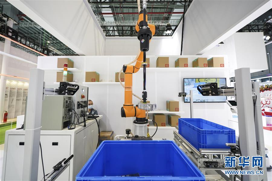 11月5日在第三屆進博會服務貿易展區拍攝的物流分揀機器人。新華社記者 張豪夫 攝