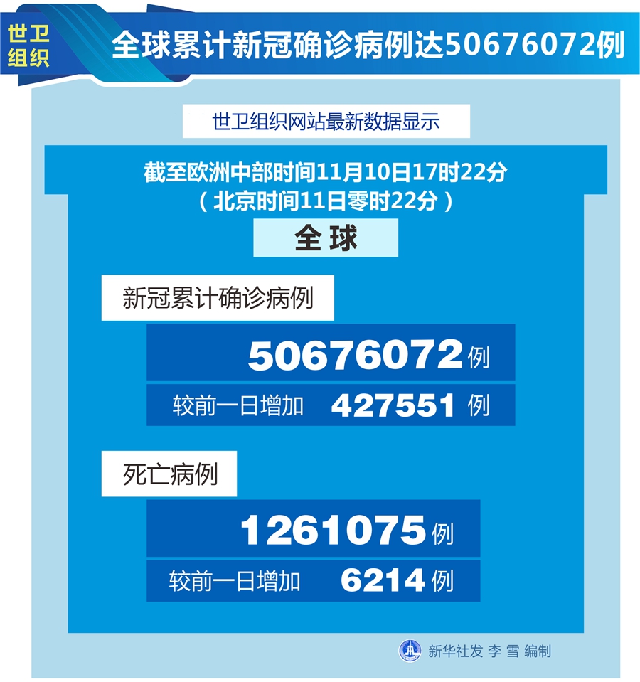 世衛組織網站最新數據顯示,截至歐洲中部時間10日17時22分(北京時間11日零時22分),全球確診病例較前一日增加427551例,達到50676072例;死亡病例增加6214例,達到1261075例。