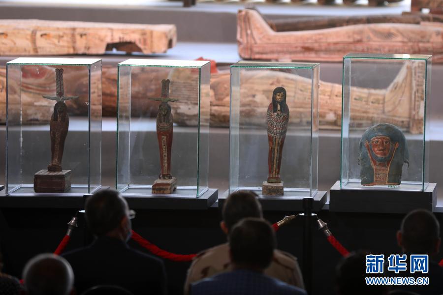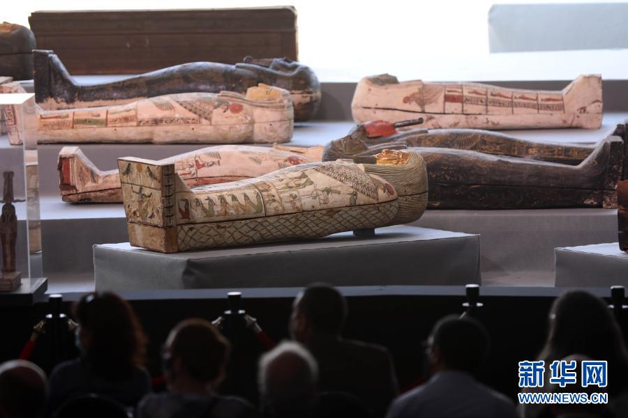 這是11月14日在埃及吉薩拍攝的彩繪木棺和其他出土文物。新華社發(艾哈邁德·戈馬攝)