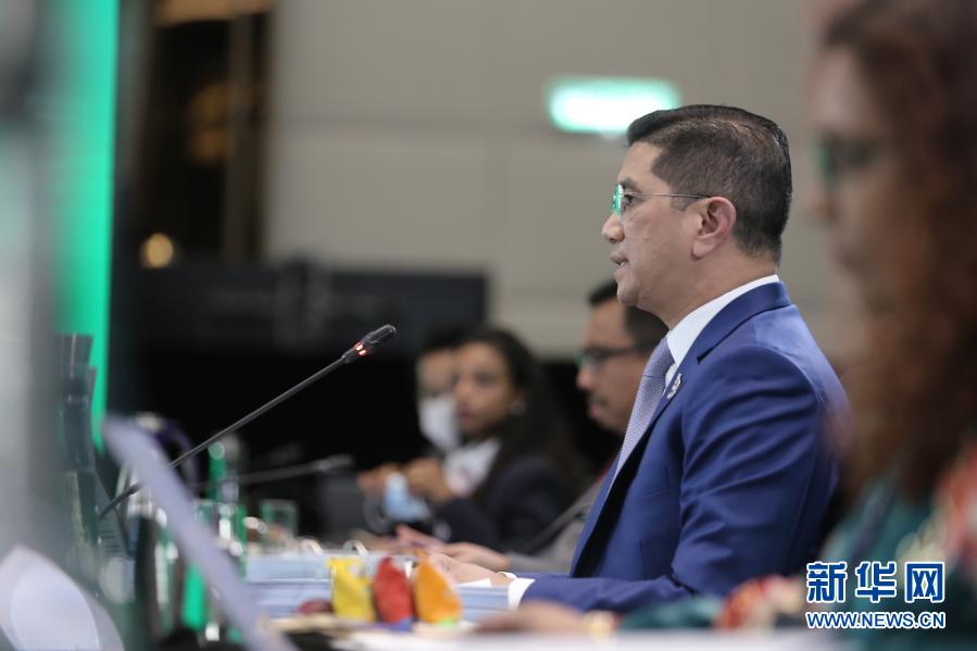 11月16日,在馬來西亞吉隆坡,馬來西亞國際貿易和工業部部長阿茲明·阿里在亞太經濟合作組織部長會議上講話。新華社發(亞太經合組織供圖)