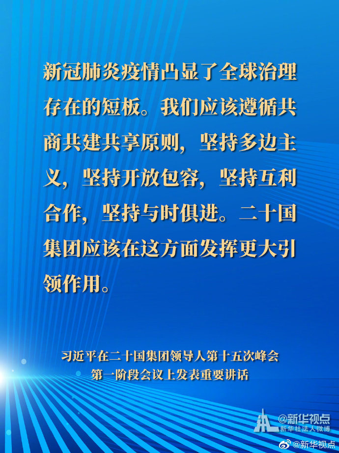 國(guó)家主席習(xí)近平21日晚在北京以視頻方式出席二十國(guó)集團(tuán)領(lǐng)導(dǎo)人第十五次峰會(huì)第一階段會(huì)議并發(fā)表重要講話。以下是講話要點(diǎn)。