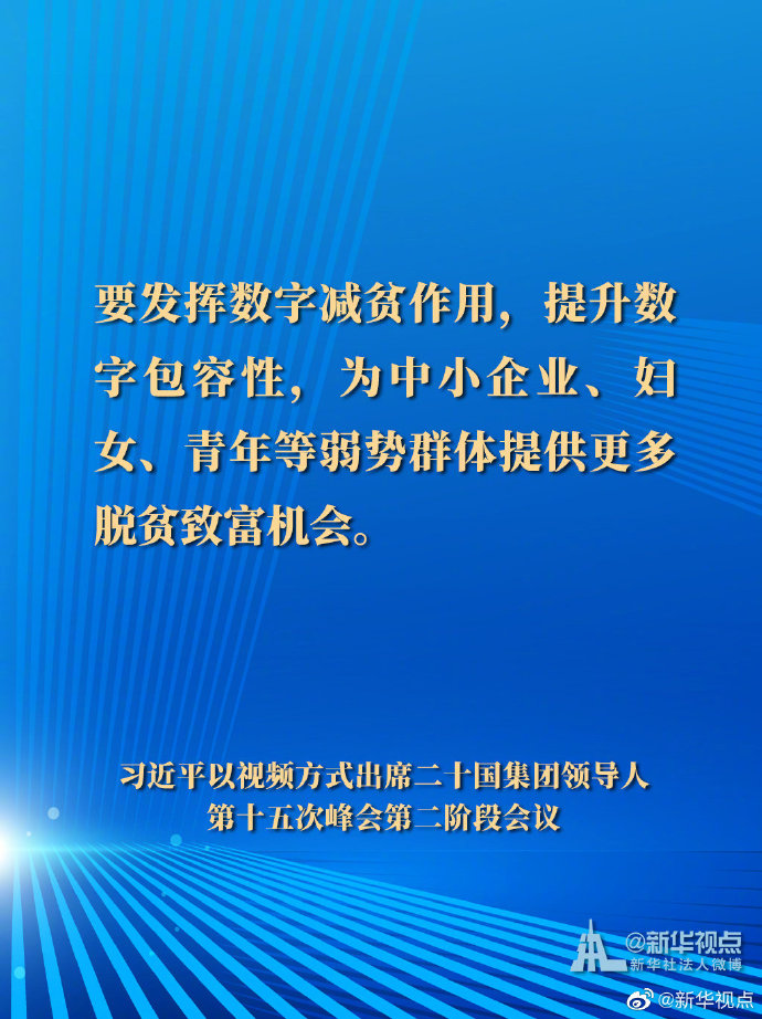 國家主席習近平11月22日晚在北京以視頻方式出席二十國集團領導人第十五次峰會第二階段會議。一起來看習主席的講話要點?