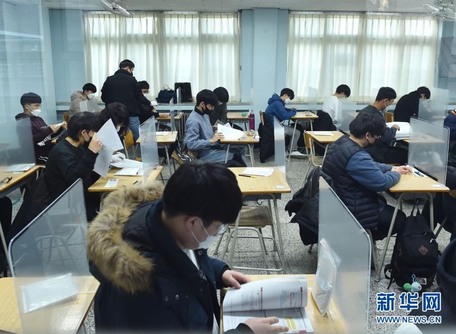 12月3日,在韓國京畿道城南市,考生們準備參加考試。新華社發(李相浩 攝)