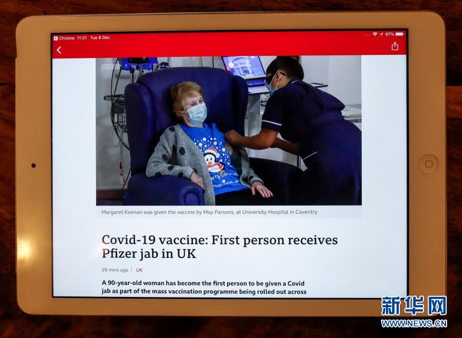 12月8日在英國倫敦拍攝的播放新聞的電腦屏幕顯示,醫護人員為90歲女子瑪格麗特·基南接種疫苗。瑪格麗特·基南是該國首位接種新冠疫苗的人。