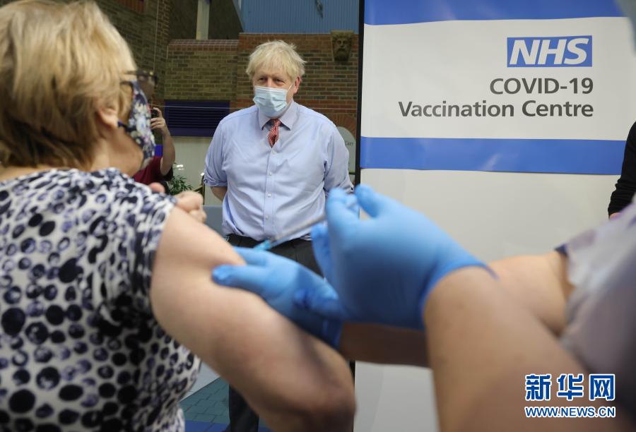 12月8日,英國首相鮑里斯·約翰遜在倫敦一家醫院的疫苗接種中心觀看一名女子接種疫苗。