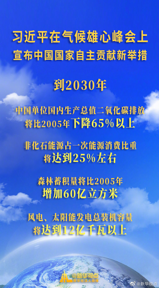 12月12日,國家主席習近平在氣候雄心峰會上宣布中國國家自主貢獻新舉措。 ??