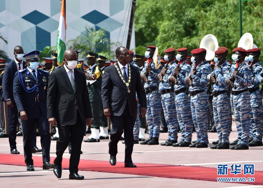 12月14日,在科特迪瓦阿比讓?zhuān)咚ㄇ坝遥┬木吐毢髤⒓訖z閱儀式。新華社發(fā)(伊萬(wàn)·宋攝)
