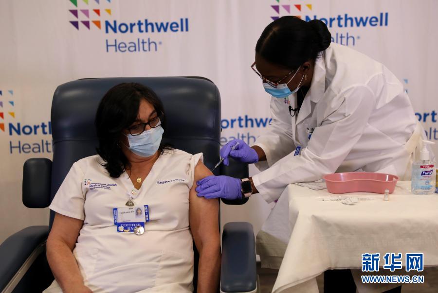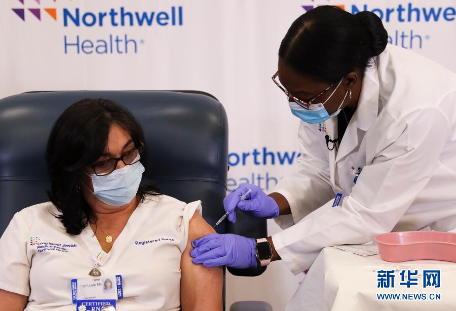 12月14日,在美國紐約長島猶太醫療中心,護士斯蒂芬妮·凱爾(左)接種新冠疫苗。新華社記者王迎攝