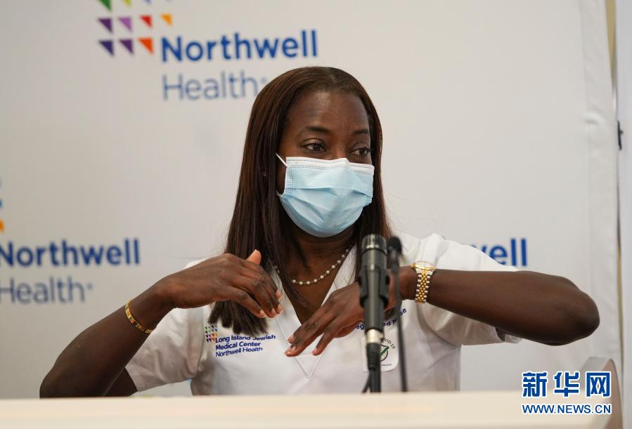 12月14日,在美國紐約,長島猶太醫療中心重癥監護室護士桑德拉·琳賽接種新冠疫苗后參加新聞發布會。新華社記者王迎攝