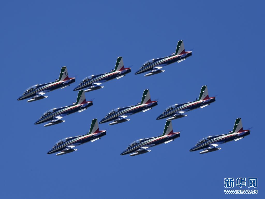 當(dāng)日,意大利“三色箭”飛行表演隊在意大利首都羅馬舉行飛行表演,慶祝意大利空軍建立98周年。