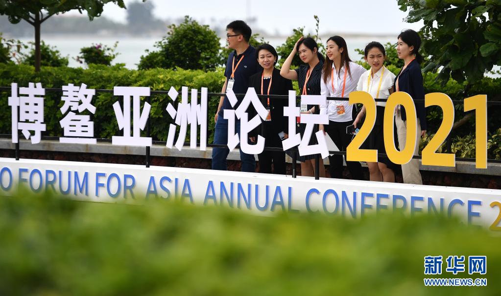4月18日,參會人員在博鰲亞洲論壇2021年年會標志前合影留念。