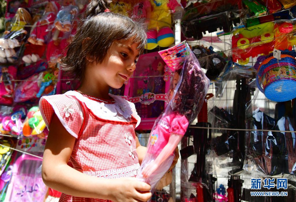 5月11日,一名女孩在敘利亞首都大馬士革的市場(chǎng)上拿起挑選的玩具娃娃。