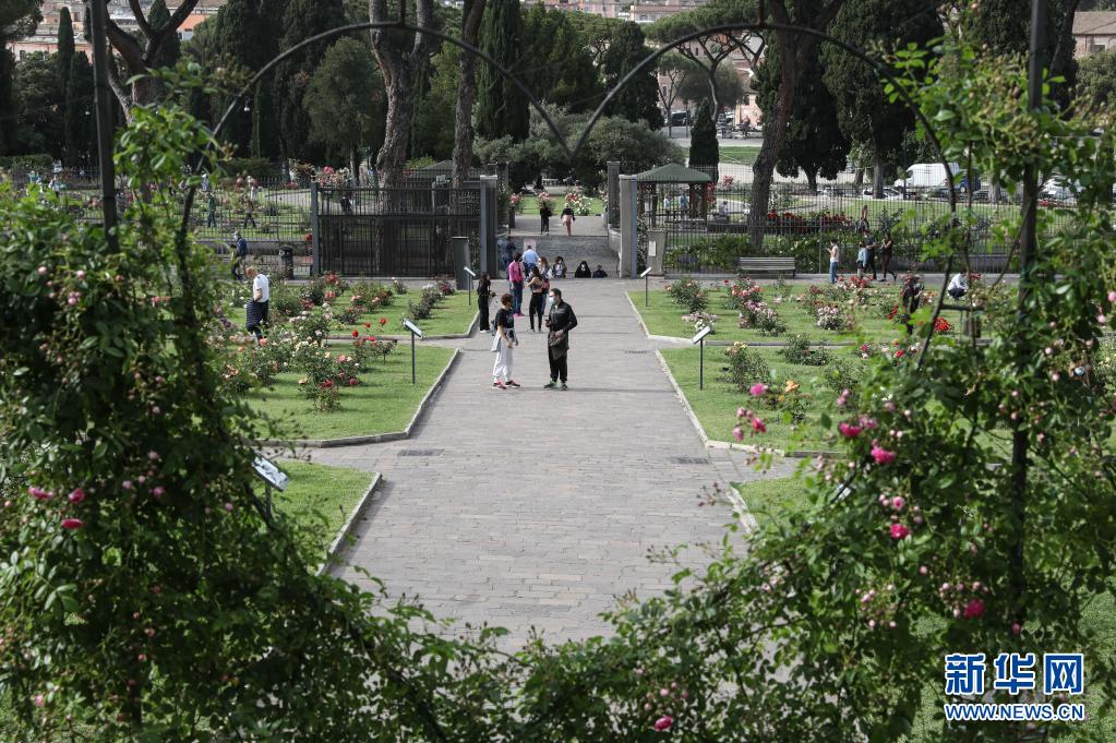 5月17日,人們在意大利首都羅馬玫瑰園游覽。