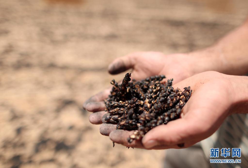 5月22日,在加沙地帶汗尤尼斯,巴勒斯坦農民手捧被以色列炮擊燒焦的麥子。新華社發(亞西爾攝)