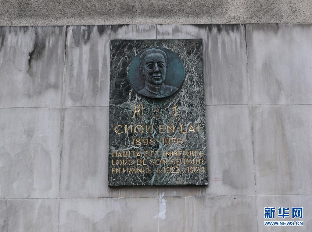 這是2021年4月11日在法國巴黎十三區戈德弗魯瓦街上的“海王星旅館”外拍攝的帶有周恩來頭像浮雕的紀念牌。新華社記者 高靜 攝