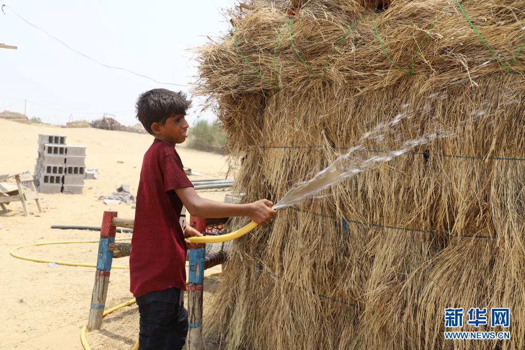 6月17日,一名男孩在也門北部哈杰省的一座難民營內給自家的茅草屋澆水降溫。