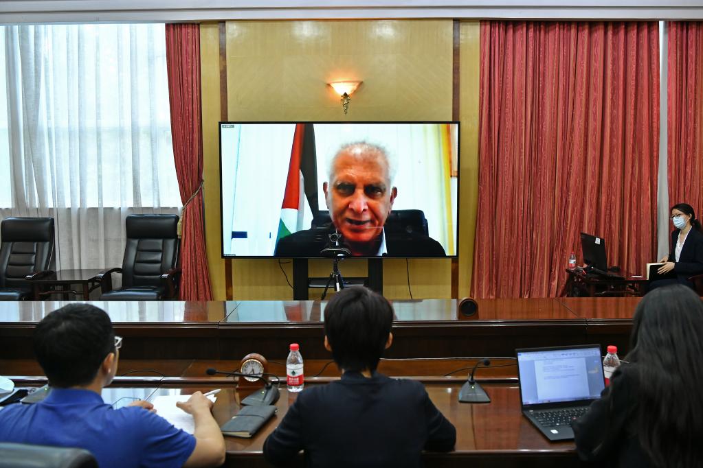 5月27日,巴勒斯坦人民黨總書(shū)記巴薩姆·薩利希通過(guò)視頻連線(xiàn)接受記者采訪(fǎng)。新華社記者李鑫攝