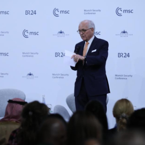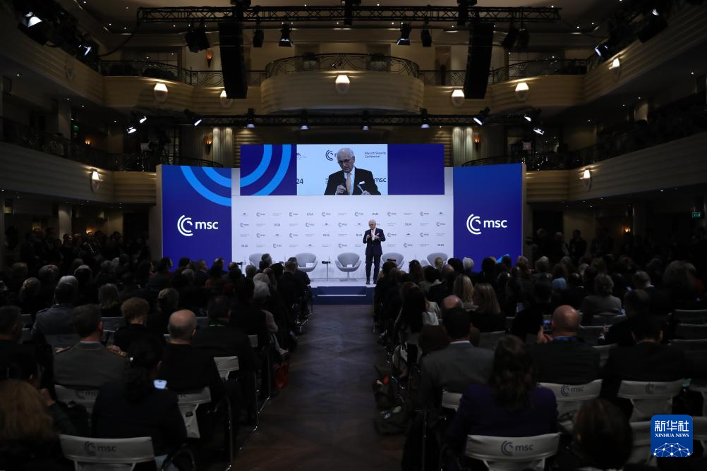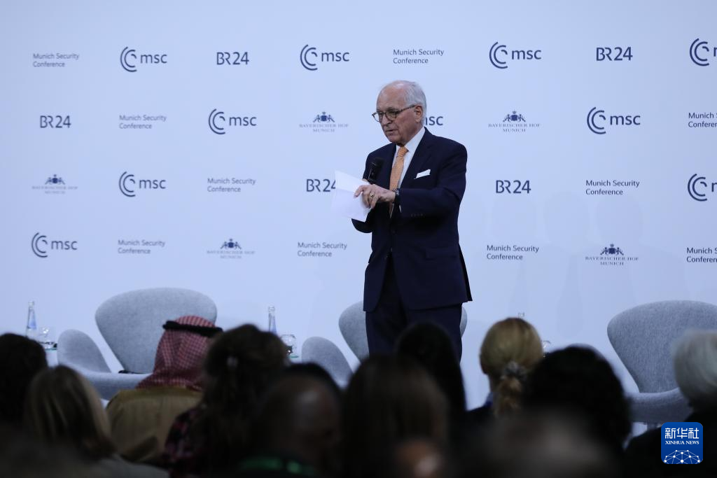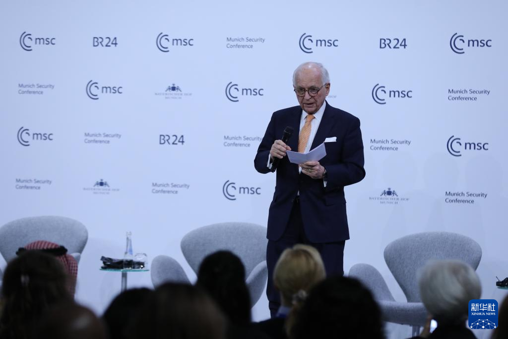 2月15日,在德国慕尼黑,慕安会主席沃尔夫冈·伊申格尔在闭幕式上致辞。新华社记者 杜哲宇 摄